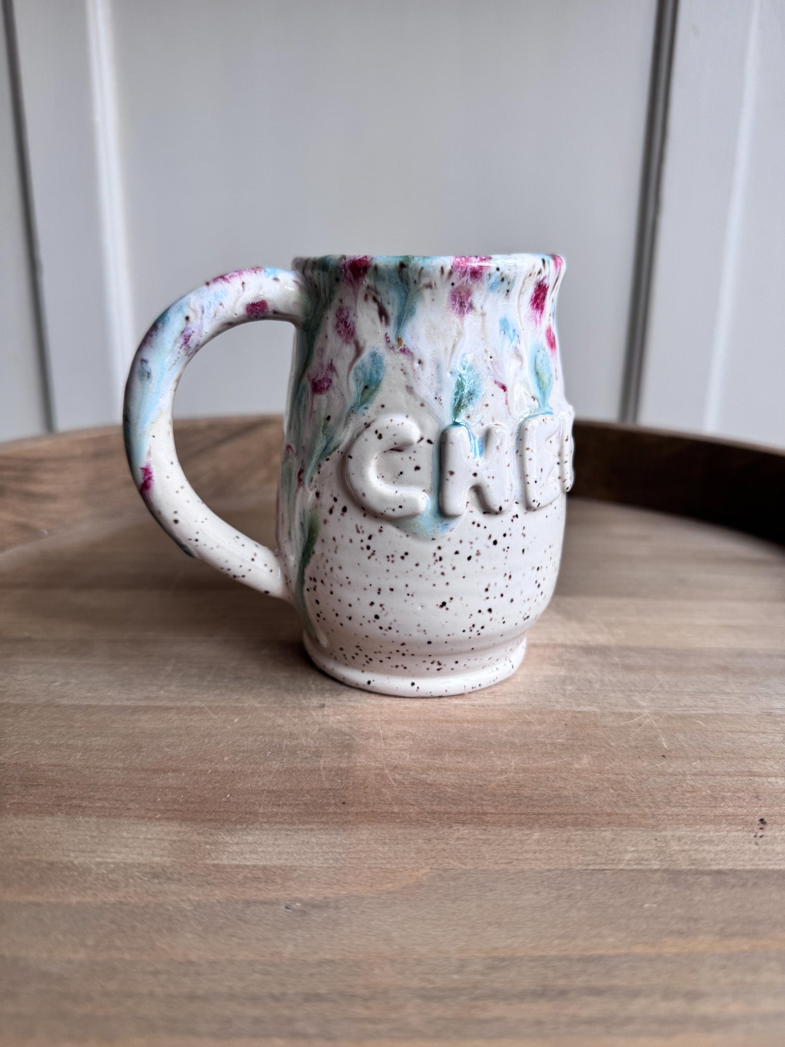 Made with a speckled white clay body, using traditional tools and techniques. This pot has a white CHEER design, ready to brighten your Christmas day. A smooth glaze finishes the mug.