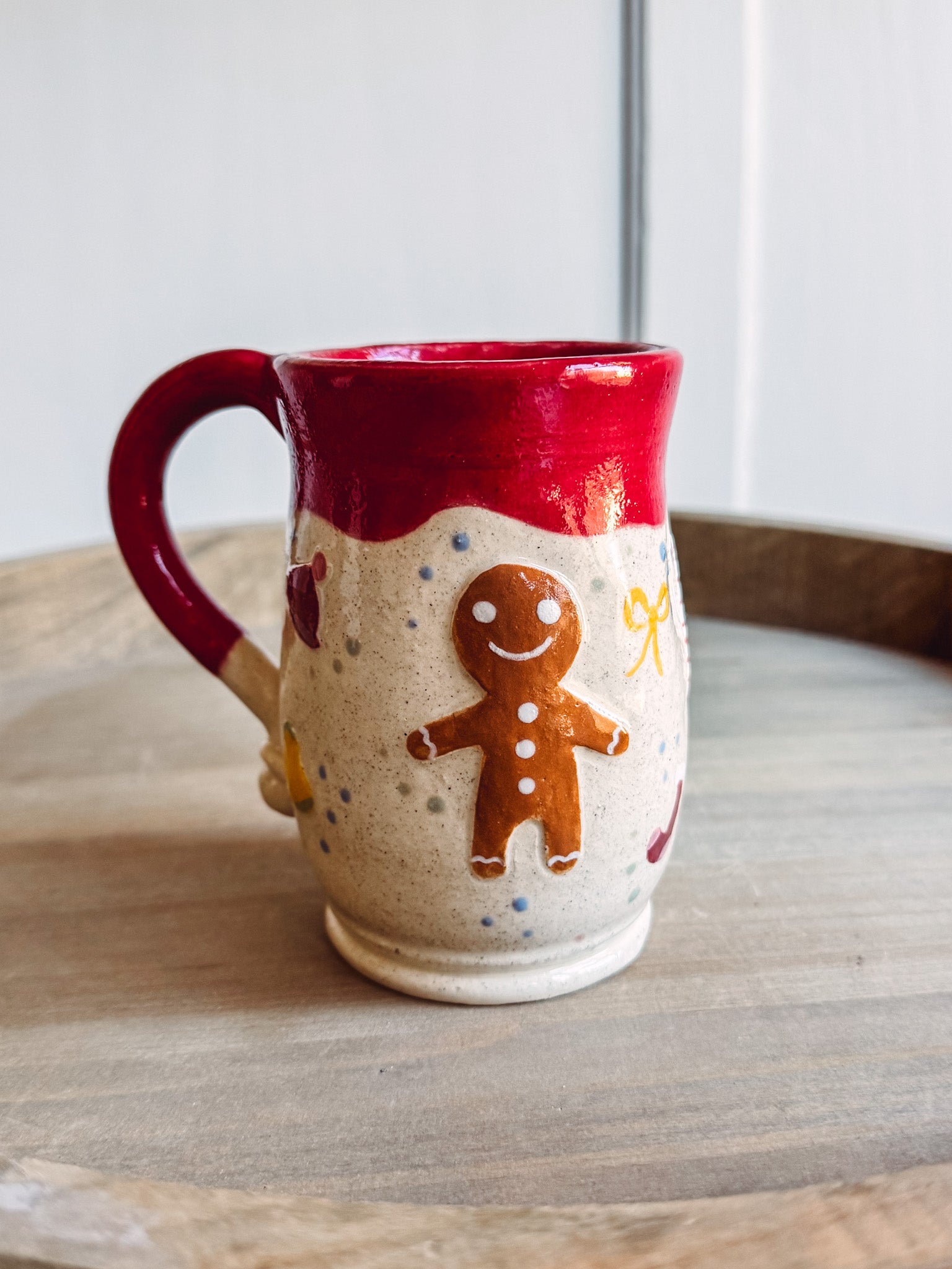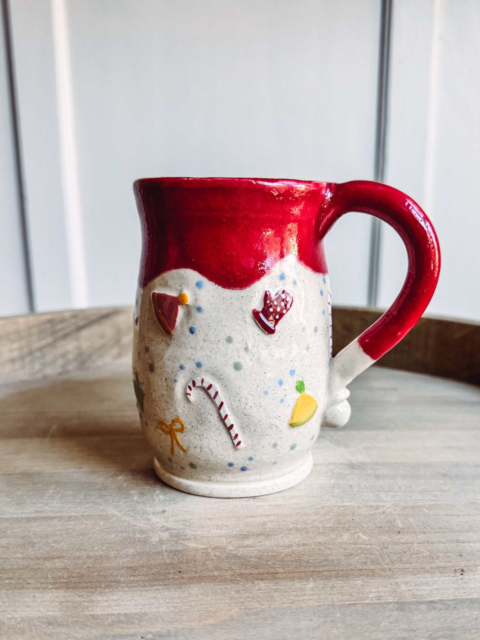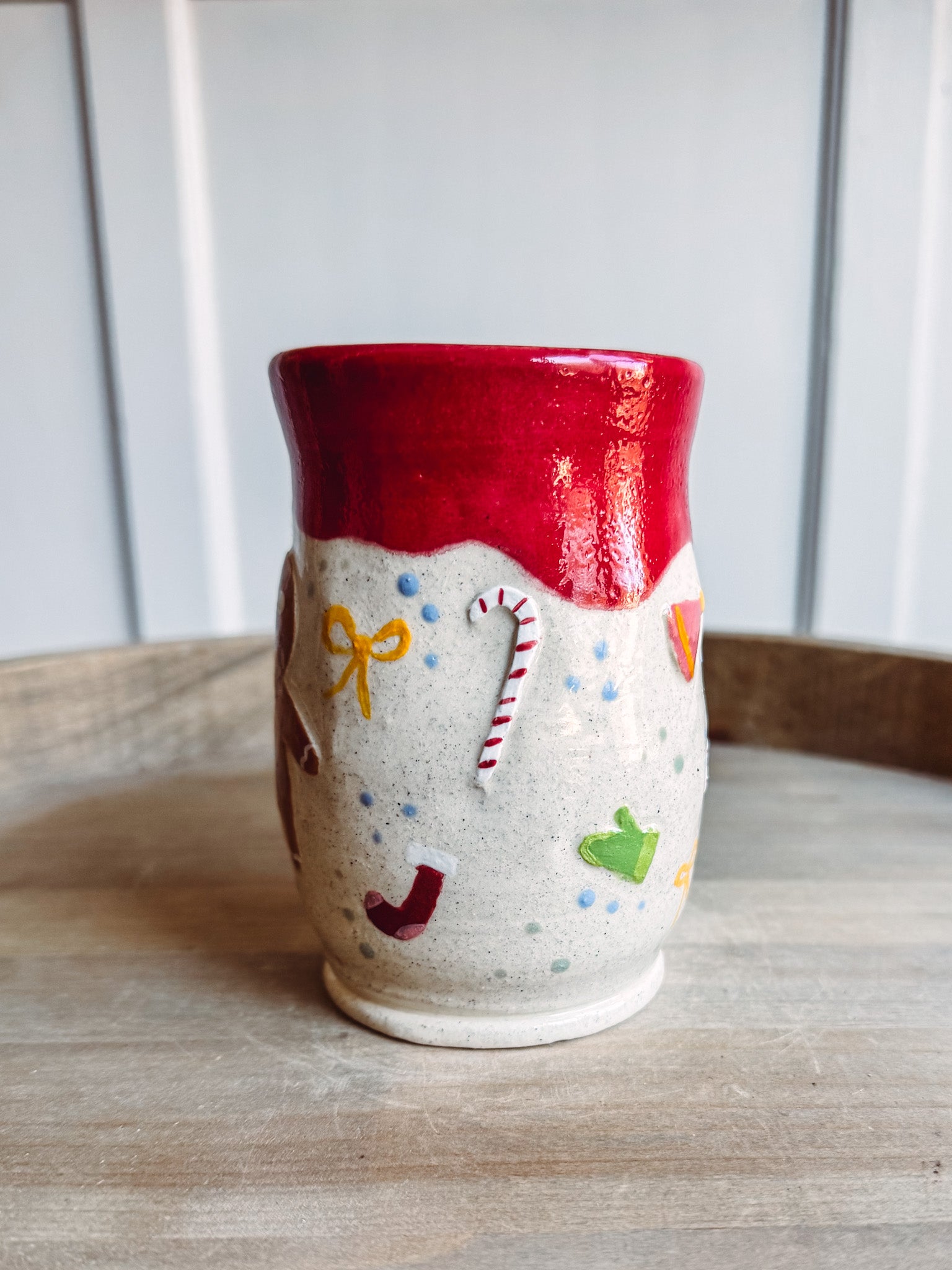 Made with a  white clay body, using traditional tools and techniques. This pot has a  winter  design, ready to brighten your Christmas day. A smooth glaze finishes the mug.