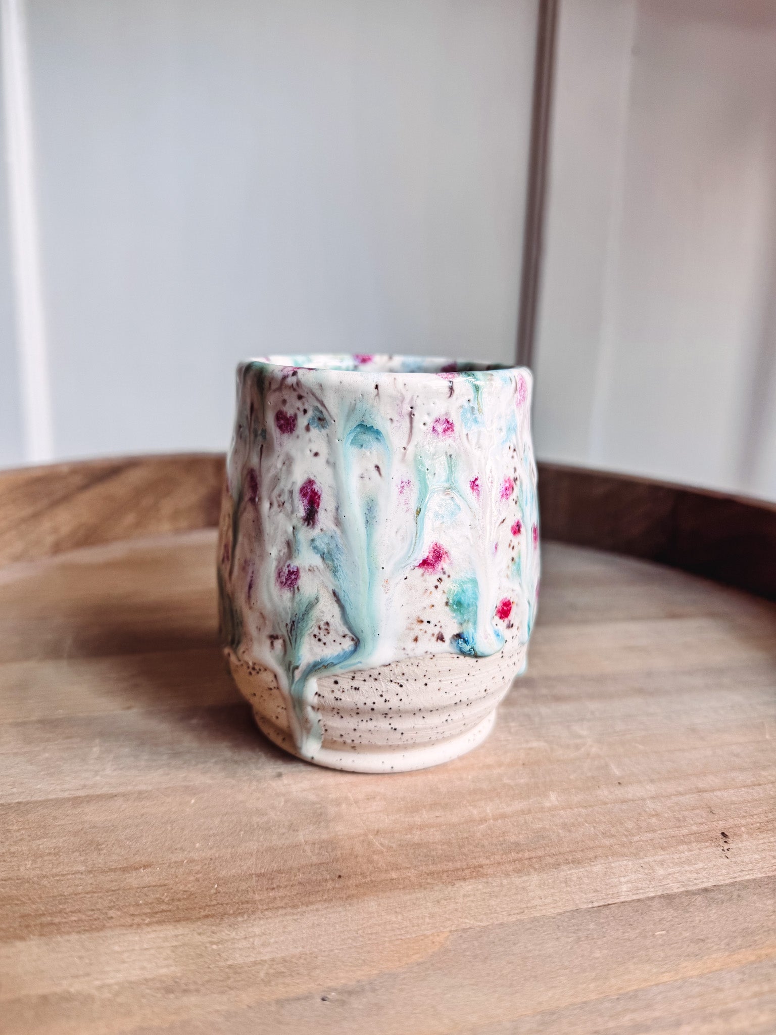 Made with a speckled clay body, using traditional tools and techniques. This pot has a colorful design, ready to brighten your Christmas day. A smooth glaze finishes the cup.